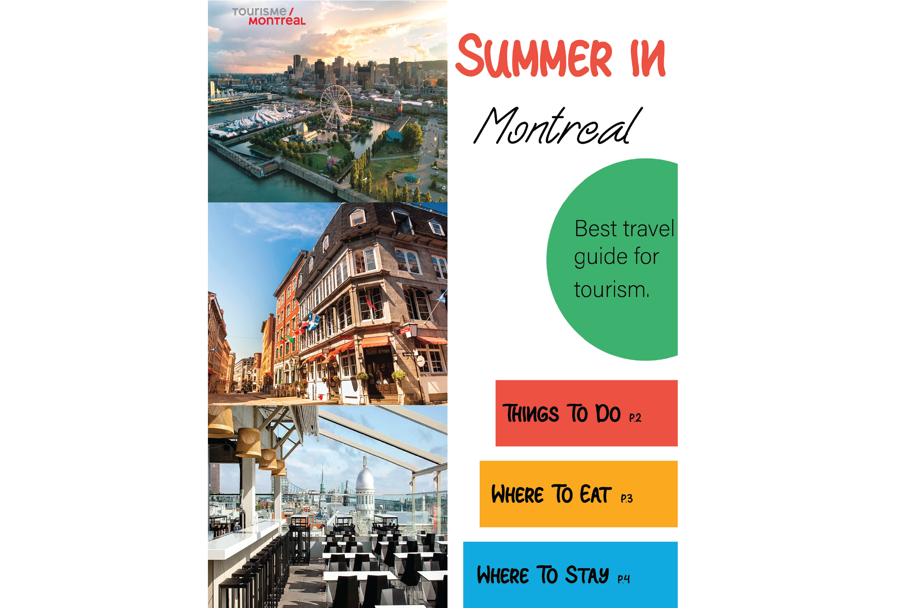 The project is to create a newsletter for Tourisme Montreal that includes a front cover, one spread, and a back cover
